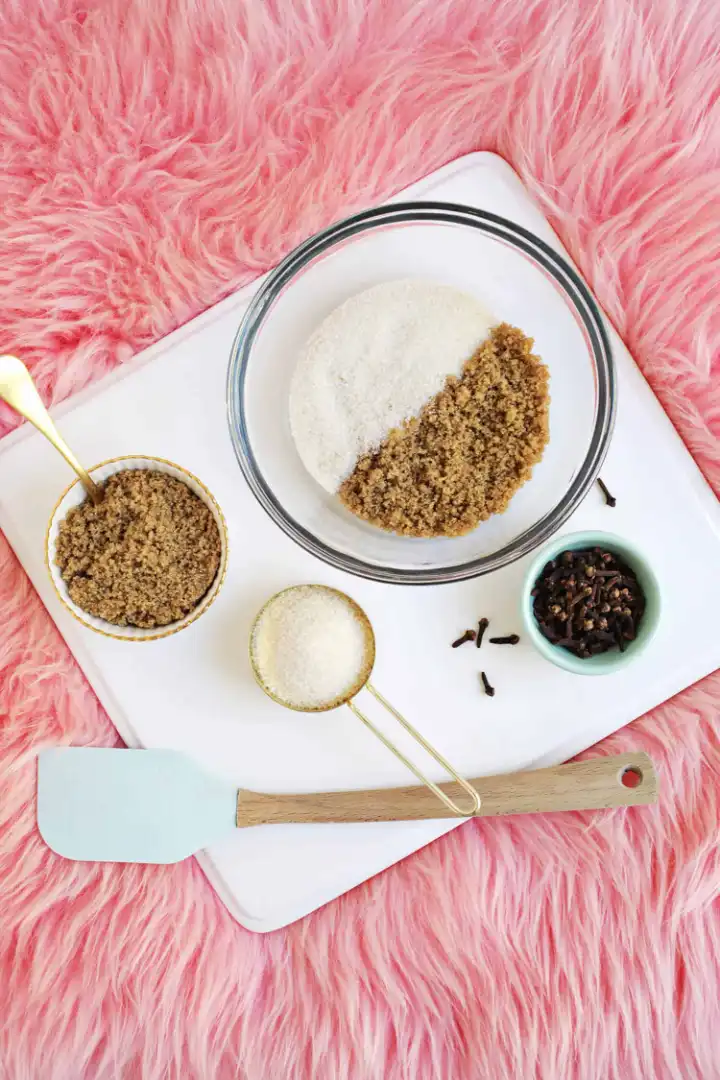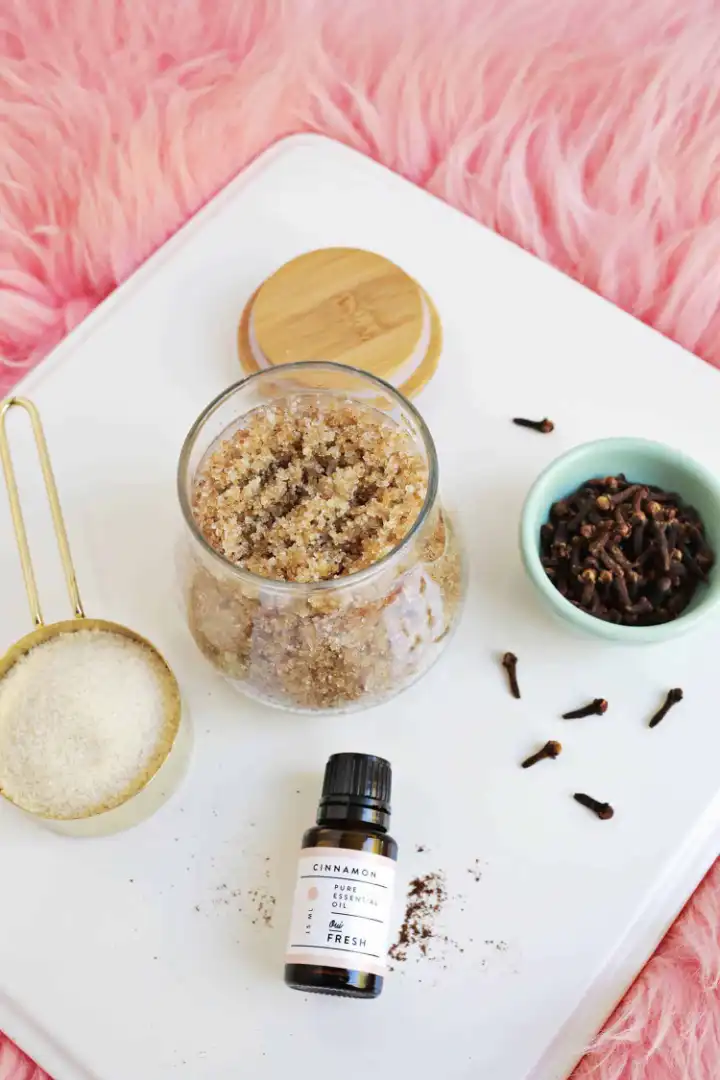 Glass jar for storageAdd your brown and white sugar in a glass mixing bowl and stir to combine. Also mix in your ground herb nails.Melt your coconut oil and let your essential oil fall into your cinnamon. Stir to combine.