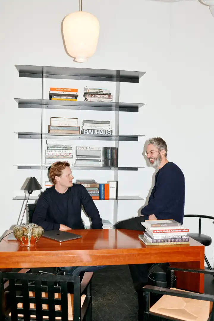 When Monocle visits Toteme’s Stockholm headquarters in the Stureplan neighbourhood, we find Halleröd sitting across from Lindman – a position you’ll find him in whether the duo are sharing design references or plotting their next project. “With every new shop, we’re getting closer to what Toteme stands for,” says Halleröd. “As interior architects, we try to align with the brands that we partner with by following their work and putting in the research.” When the pair envision a new space, they try to capture Toteme’s aesthetic with neutral palettes and playful antique finds that add warmth and signal that this is far from your average Scandinavian minimalist label. “We want to be generous to our customers,” says Lindman (pictured, on left, with Halleröd). “Their time is important.”