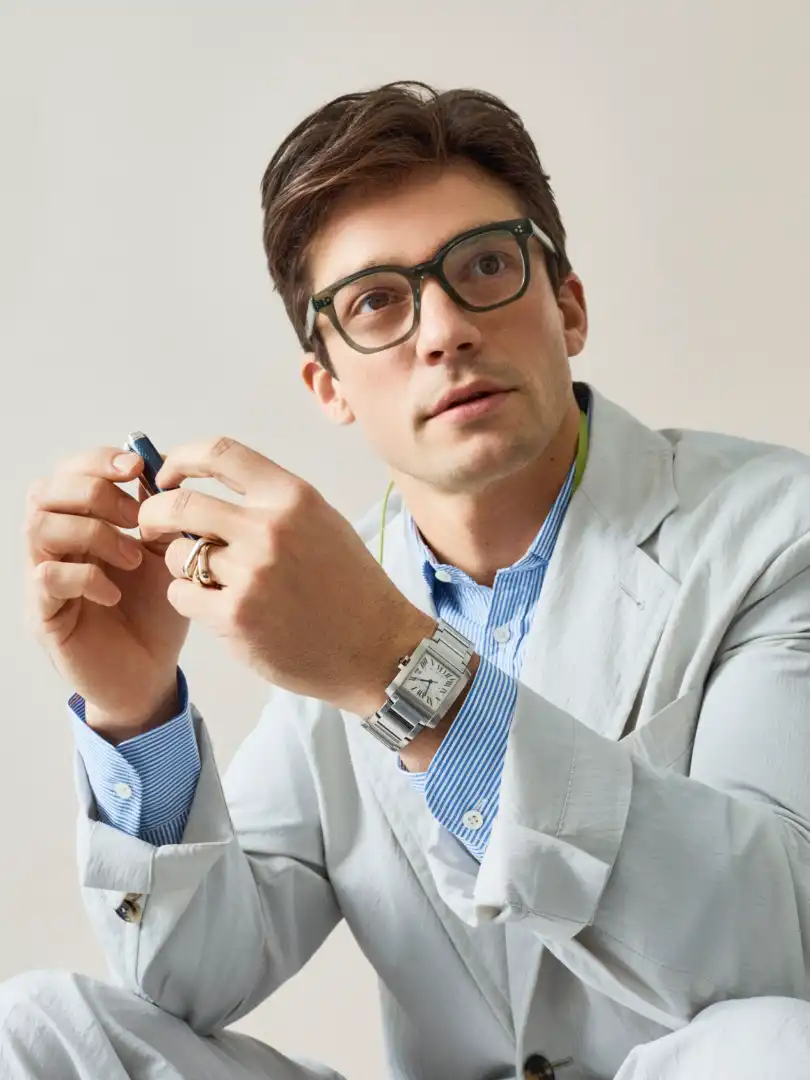 Jacket and trousers by Hermès, shirt by Massimo Alba, glasses by Oliver Peoples, pen by ST Dupont,