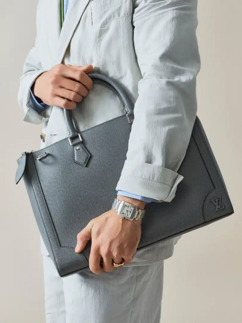 Bag by Louis Vuitton, Tank Française watch and Trinity ring by Cartier, glasses case with lanyard by Valextra