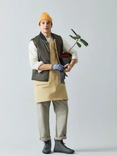 gilet byMackintosh, apron and garden gloves byNiwaki, shirt byLoro Piana, t-shirt byBaracuta, trousers by Arpenteur, trainers byMoonstar, beanie by Colorful Standard