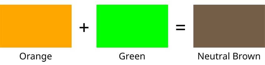 So, green mixed with orange will create a neutral hue, namely a shade of brown.