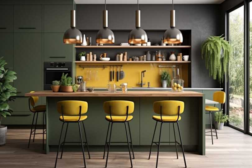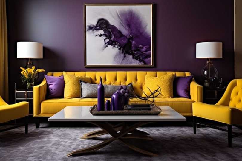 ToggleThe Different Shades of Yellow The differentshades of yellowplay a large role in when deciding on what colors go with yellow. Although a predominantlywarm color, yellow can have cool undertones as well, which can change the look and feel of the entire interior. Below is a list of some of the different shades of yellow and their color values.ShadeHex CodeCMYK Color Code (%)RGB Color CodeColorMustard#FFC9010, 21, 100, 0255, 201, 1 Warm Yellow#FFE1010, 12, 100, 0255, 225, 1 Neutral Yellow#FFFF000, 0, 100, 0255, 255, 0 Lime#E6FF4F10, 0, 69, 0230, 255, 79 Pastel Yellow#FFED810, 7, 49, 0255, 237, 129 What Color Goes With Yellow? Below we will be looking at specific shades of yellow and what colors they pair well with in an interior setting. Keep in mind that these pairings are not set in stone and playing around with the shades within the pairings can create even more interesting color combinations.For a dramatic interior, make use of dark purple as the predominant color, with subtle pops of yellow to create contrast and interest.